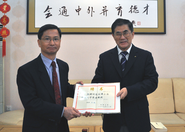 丘进校长为何思兵博士(左)颁发客座教授聘书