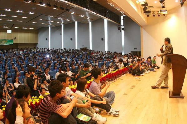 “当代青年人的创业领袖”俞敏洪的闪亮出场,把当晚讲座的气氛推向高潮。在如潮的掌声中,俞敏洪联系自身曾经在贫穷、挫折、失败和屈辱的泥潭中一再奋起,直至成功打造新东方的传奇人生经历,并旁征博引经典案例,指点人生成功秘诀:目标明确,用心专一,持之以恒。他勉励华大学子,要执着于青春梦想,在挫折和失败中,要坚持、坚持、再坚持;对待大学生活,要做到“四认真”:认真对待学习,认真对待友谊,认真对待恋爱,认真对待工作;大学期间,一定要博览群书,精读经典,读书有厚度,人生才能有高度。句句至理名言,与华大学子产生强烈共鸣。历时两个半小时的讲座在如潮的掌声中结束,听众还意犹未尽,依依不舍。华大学子“对成功的强烈期待”和在公众场合所表现的“有序、文明、有耐心”给新东方嘉宾留下深刻印象。