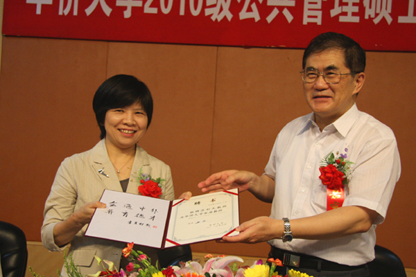 2010级MPA开学典礼上,校长丘进为台湾大学政治系教授苏彩足颁发华大客座教授聘书