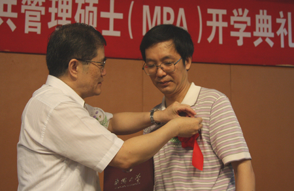 2010级MPA开学典礼上,校长丘进为华大兼职教授丁煌佩戴校徽