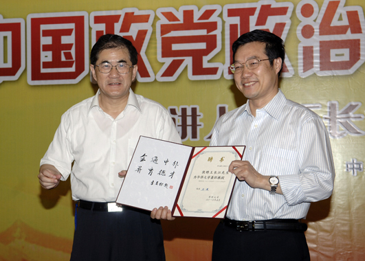 丘进校长向王长江教授(右)颁发“华大讲堂”主讲嘉宾纪念牌(张为健 摄)