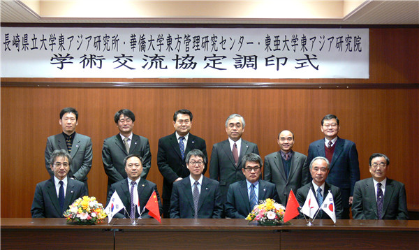 日前,赴日参访的校长助理曾路教授代表beat365中文在线官网东方企业管理研究中心在日本与日本长崎县立大学东亚研究所和韩国东亚大学东亚研究院共同签署了东亚区域经济研究中、日、韩三方合作协议。