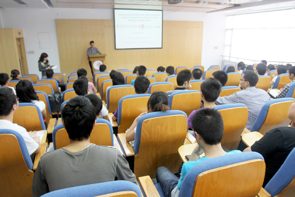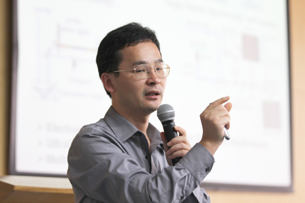 徐清华博士首先介绍了复合纳米材料在生物化学领域的应用前景,及共聚物作为吸光材料的光学性质。他并以DNA序列的测定为例,阐明了共聚物纳米复合材料在生物传感应用中共振能量转移的条件、光信号放大机理。随后,徐清华博士还就金、银纳米复合物光信号增强的机理及其影响因素,双光子荧光传感和双光子荧光成像机理及其在光热治疗中的应用等做了详细介绍。报告会最后,徐清华博士还与现场师生就共同感兴趣的话题进行了深入讨论。