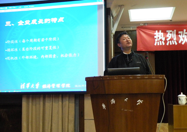 在经管大楼12楼多媒体教室,雷家骕教授结合自身丰富的企业实战管理经验和专业领域研究成果,从企业成长的本质、特点、影响因素、主要途径、过程控制等方面进行了深入浅出的讲解。