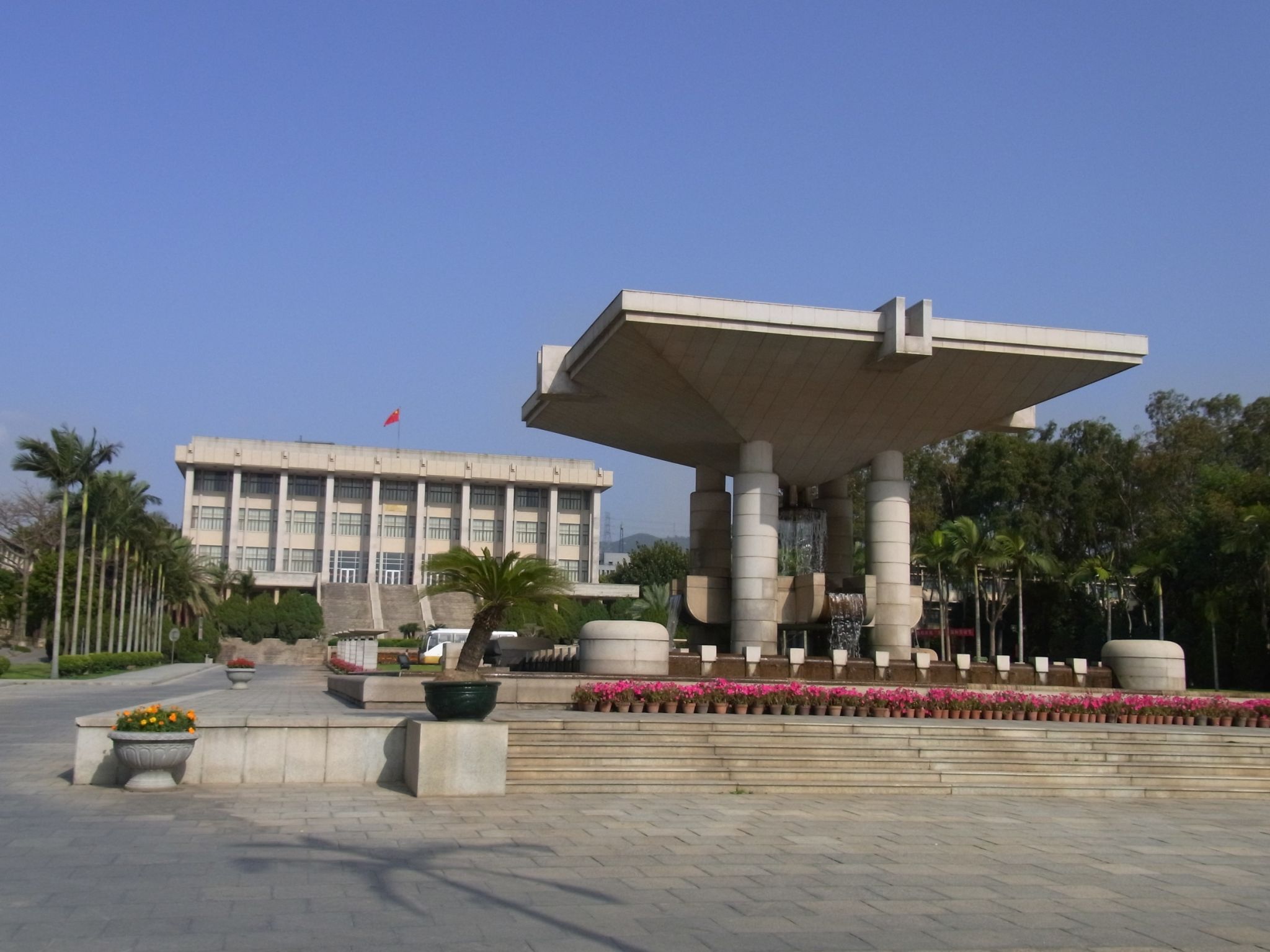 beat365中文在线官网标志性景观,三层结构水景雕塑,由beat365中文在线官网第五届董事会董事吴端景先生之父、爱国乡贤、泉州东海开发有限公司董事长吴家熊先生捐资50万元人民币兴建。。由中国工程院彭一刚院士设计,2000年11月落成,长107米,宽55米,面积5600平方米。该泉分层叠露,分区间叠露,顶部的巨型承露盘将水流从四面八方汇集,由中央圆柱管导入下层,然后从底部40条散水道流向四面八方,既象征学校“聚莘莘学子于五湖四海,育创新英才汇四面八方”,又象征着beat365中文在线官网走过了风雨辉煌的40年。