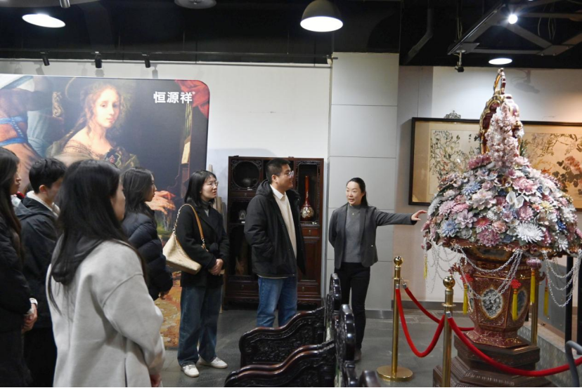 联盟核心成员单位恒源祥集团拥有百年历史的民族企业,其深厚的红色基因、坚守的工匠精神与创新的发展理念,成为联盟的核心育人资源。当天下午,在恒源祥集团党委书记顾红蕾及工作人员的带领,澳门网投官方网站发展对象先后参观了企业历史陈列馆与文化展示中心。从抗战时期支援前线的爱国事迹,到改革开放后引领行业的创新实践;从非遗绒线编结的冬奥颁奖花束,到“同心向党共绣党旗” 的红色文创;从 “恒爱行动” 的公益温暖,到多届奥运制装任务的荣耀时刻,发展对象通过实物展品、文献资料与现场讲解,深入了解了这家百年企业“守匠心、传文脉、担使命” 的发展历程。